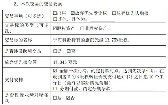 同日,旗滨集团公布,公司控股子公司湖南旗滨光能科技有限公司的少数股东宁海旗滨科源拟将其持有的旗滨光能13.75%股权(对应的初始跟投价格为1.13元/1元注册资本,初始跟投金额为50,000万元)以47,345万元的价格转让给中国东方资产管理股份有限公司。根据,本次股权转让过程中,公司对标的股权享有优先购买权。公司决定放弃该优先购买权。