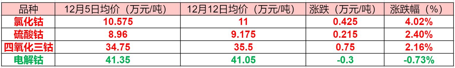 据SMM现货报价显示,本周氯化钴现货报价同样呈现上涨态势,截至12月12日,氯化钴现货报价涨至10.8~11.2元/吨,均价报11万元/吨,较12月5日上涨4250元/吨,涨幅达4.02%。