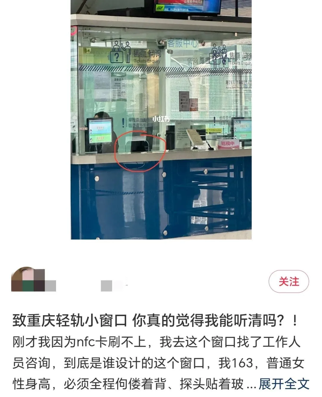 网友在文章中表示,她在乘坐重庆地铁时,因NFC卡无法正常刷卡,前往轨道交通客服中心咨询。然而,由于隔着玻璃窗声音听不清,她不得不全程弯腰驼背,将头贴近一个仅1.2米高的窗口,才能听清工作人员讲话。该网友认为,咨询窗口的设计未充分考虑乘客身高和交流舒适度,并调侃:“重庆轻轨小窗口,你真的觉得我能听清吗?”经视直播记者联系上发文网友,她表示,此事发生于12月10日,地点在重庆地铁6号线康庄站。