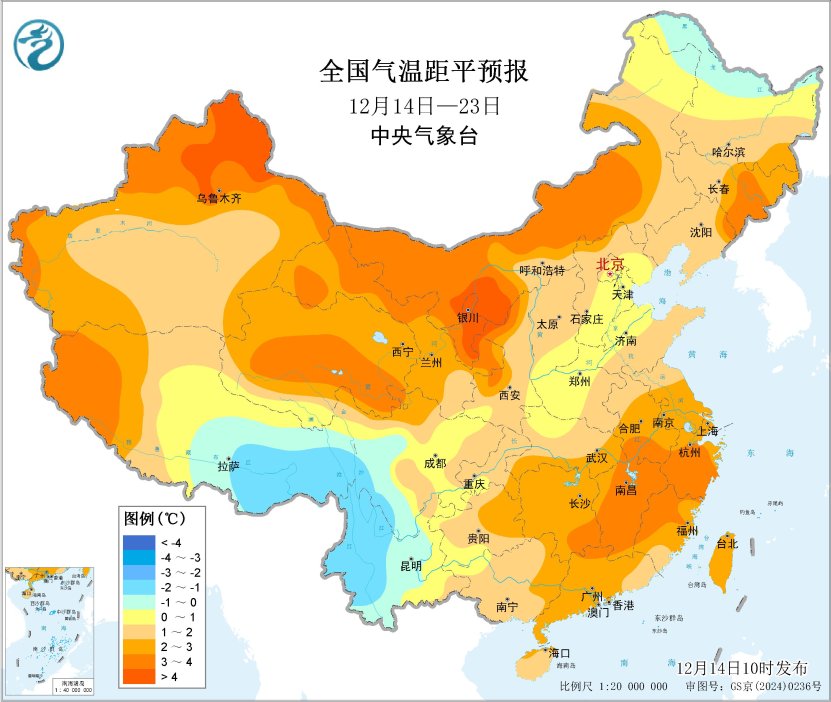 未来十天,影响我国的冷空气势力较弱,除云南、西藏东部、黑龙江北部气温偏低外,全国其余大部地区平均气温较常年同期偏高,其中,新疆北部、内蒙古中西部、甘肃、青海、宁夏、江南、华南东部等地平均气温较常年同期偏高2~4℃。