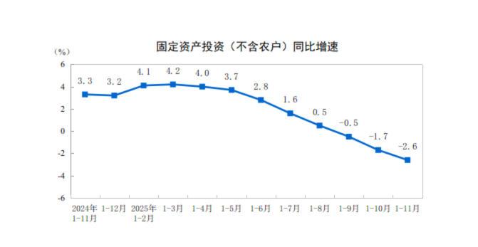 据国家统计局网站消息,2025年1—11月份,全国固定资产投资(不含农户)444035亿元,同比下降2.6%(按可比口径计算)。其中,民间固定资产投资同比下降5.3%。从环比看,11月份固定资产投资(不含农户)下降1.03%。