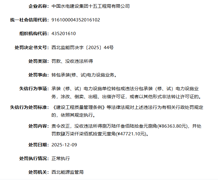 近日,国家能源局资质和信用信息系统处罚信息显示,中国水电建设集团十五工程局有限公司因转包承装(修、试)电力设施业务,被西北能源监管局处以责令改正处罚,同时没收违法所得86363.80元,并处罚款47721.10元。