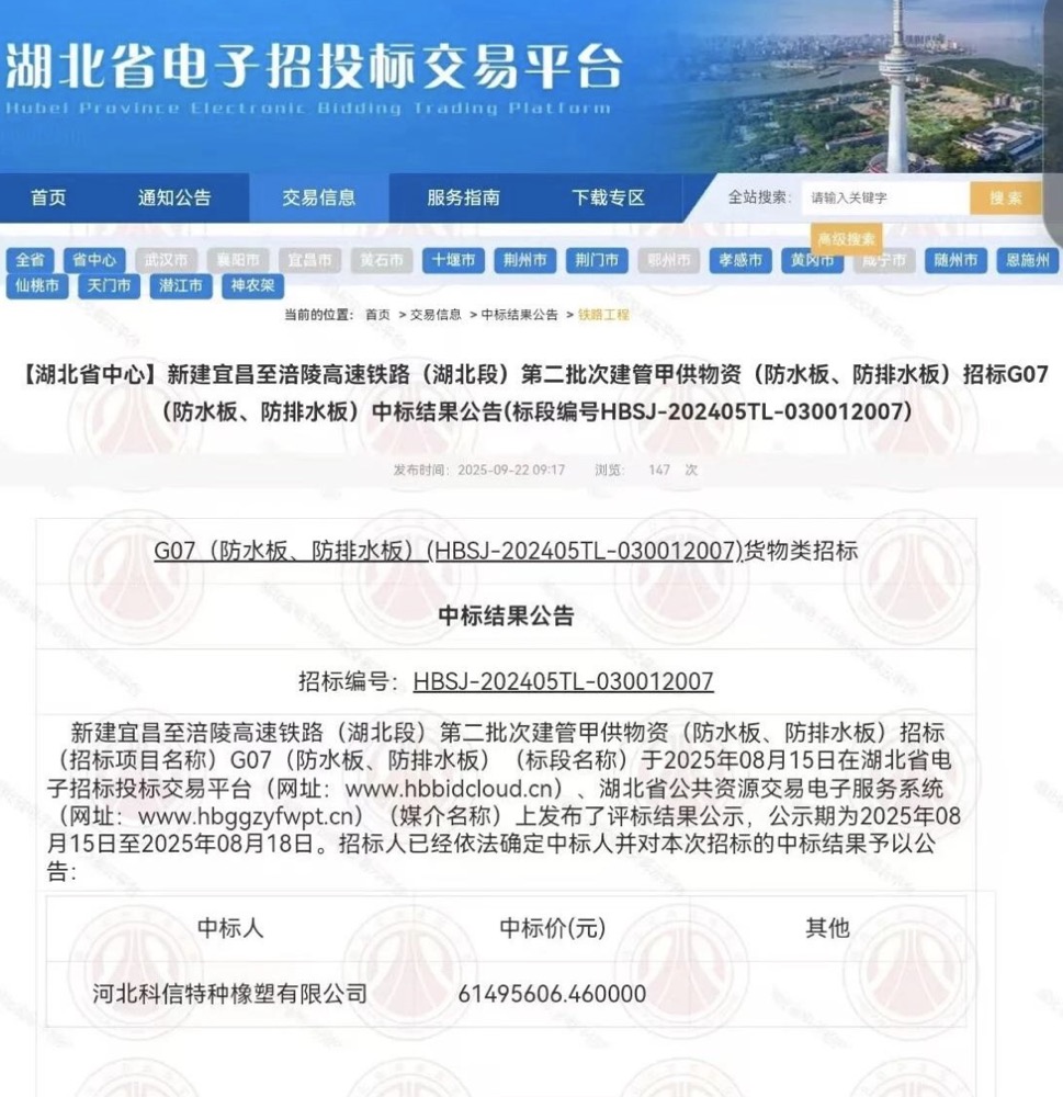 就在调查推进期间,河北科信仍在铁路项目招投标市场中标两个项目,2025年8月22日,河北科信中标长江沿岸铁路集团安徽公司(下称长江铁路安徽公司)新建铁路合肥至武汉段的供货项目,同年9月22日,再中标长江沿岸铁路集团湖北有限公司(长江铁路湖北公司)宜昌至涪陵新建铁路项目。