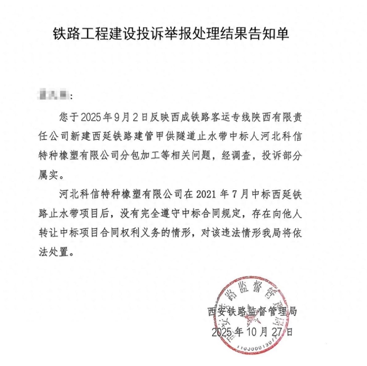 根据西安铁路监管局2025年10月27日出具的《告知单》,河北科信于2021年7月中标西延铁路止水带项目后,未完全遵守中标合同规定,存在向他人转让中标项目合同权利义务的违法行为,西安铁路监管局明确将依法处置。
