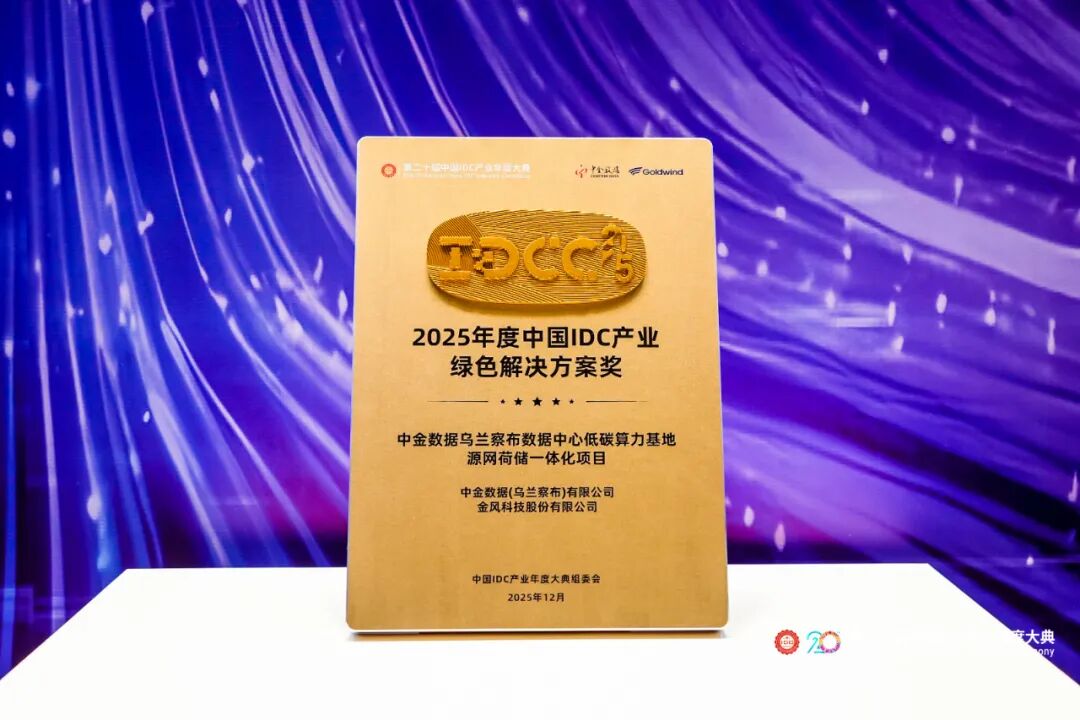 12月10日,金风科技与中金数据共同打造的“中金数据乌兰察布低碳算力基地源网荷储一体化项目”(以下简称“中金数据项目”)荣获“2025年度中国IDC产业绿色解决方案奖”。该评选历时两个月,以推动产业智能化与绿色化协同发展为评价目标,重点挖掘年度行业内的典范案例。金风科技作为唯一的获奖风电企业,以破界融合为绿色算力发展提供示范。