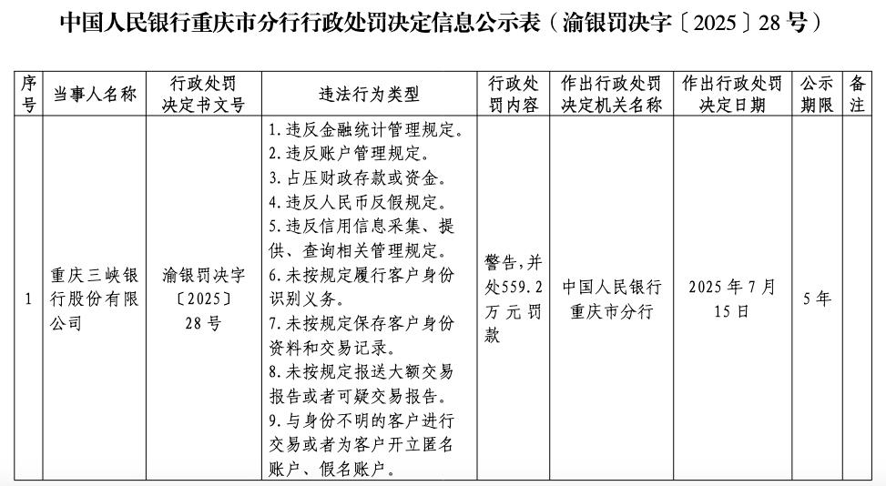 7月18日,人民银行重庆市分行行政处罚决定信息公示表显示,三峡银行因违反金融统计管理规定;违反账户管理规定;占压财政存款或资金;违反人民币反假规定;违反信用信息采集、提供、查询相关管理规定;未按规定履行客户身份识别义务;未按规定保存客户身份资料和交易记录;未按规定报送大额交易报告或者可疑交易报告;与身份不明的客户进行交易或者为客户开立匿名账户、假名账户等9项违法违规行为,被警告,并处559.2万元罚款。