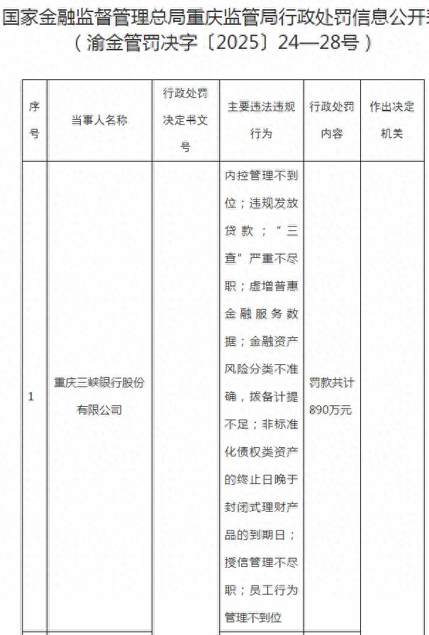 12月12日,重庆金融监管局披露的罚单显示,重庆三峡银行因内控管理不到位;违规发放贷款;“三查”严重不尽职;虚增普惠金融服务数据;金融资产风险分类不准确,拨备计提不足;非标准化债权类资产的终止日晚于封闭式理财产品的到期日;授信管理不尽职;员工行为管理不到位等,被罚款共计890万元。
