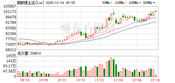 12月15日,碳酸锂期货主力合约再次突破10万元/吨,收盘价格创下2024年6月份以来新高。