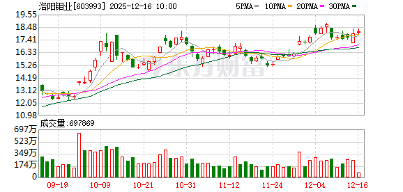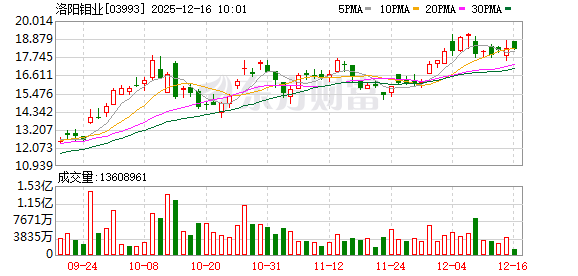 12月15日,洛阳钼业A股收盘价为17.93元/股,涨幅1.99%,H股收盘价为18.27港元/股,涨幅0.55%,总市值为3836亿元。