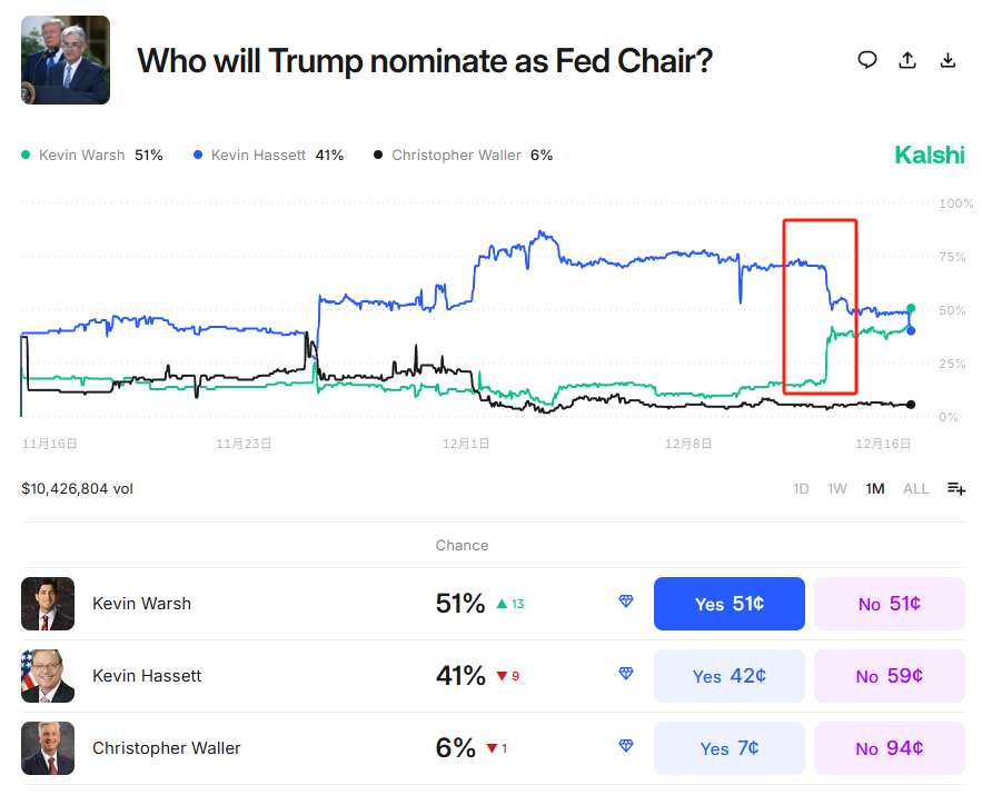尽管如此,截至周一,哈西特在Kalshi上仍以51%的概率领先,但已明显低于本月早些时候超过80%的高点;沃什的概率目前约为41%,12月初时仅在11%左右。