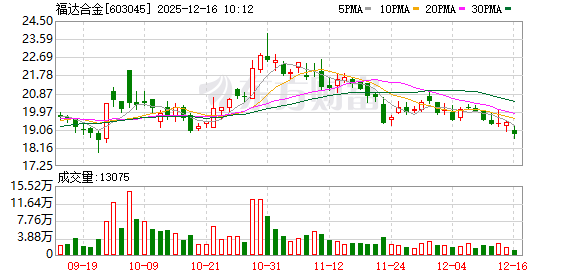 数据显示,截至12月15日收盘,福达合金股价报19.41元/股,最新市值为26亿元。