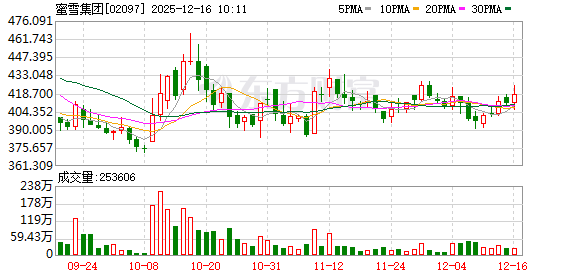 截至12月15日收盘,蜜雪冰城报410.6港元/股,股价下跌了0.34%。