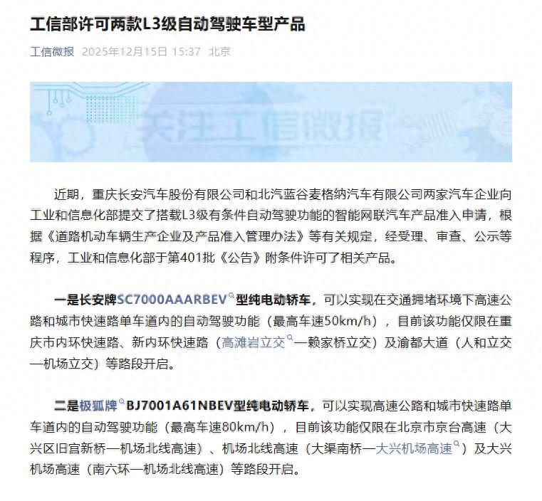 12月15日,据工业和信息化部官方公众号消息,我国首批L3级有条件自动驾驶车型准入许可公布,两款分别适配城市拥堵、高速路段的车型将在北京、重庆指定区域开展上路试点,意味着我国L3级自动驾驶从测试阶段向商业化应用迈出了关键一步。