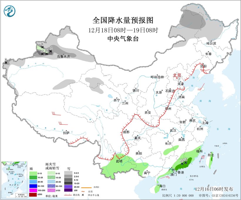 12月18日08时至19日08时,内蒙古东北部、黑龙江中北部、新疆北部和南疆西部山区、甘肃河西等地部分地区有小到中雪或雨夹雪,其中,新疆沿天山地区和伊犁河谷局地有大到暴雪(10~16毫米)。湖南南部、福建东部和南部、西南地区南部、广西西南部、广东东部和南部、海南岛东部、台湾岛东部等地部分地区有小到中雨,其中,广东东部局地有大雨(25~35毫米)。辽宁东部、西藏中北部等地部分地区有4~6级风;台湾海峡、巴士海峡、南海东北部和中东部海域将有5~7级大风、阵风8级。