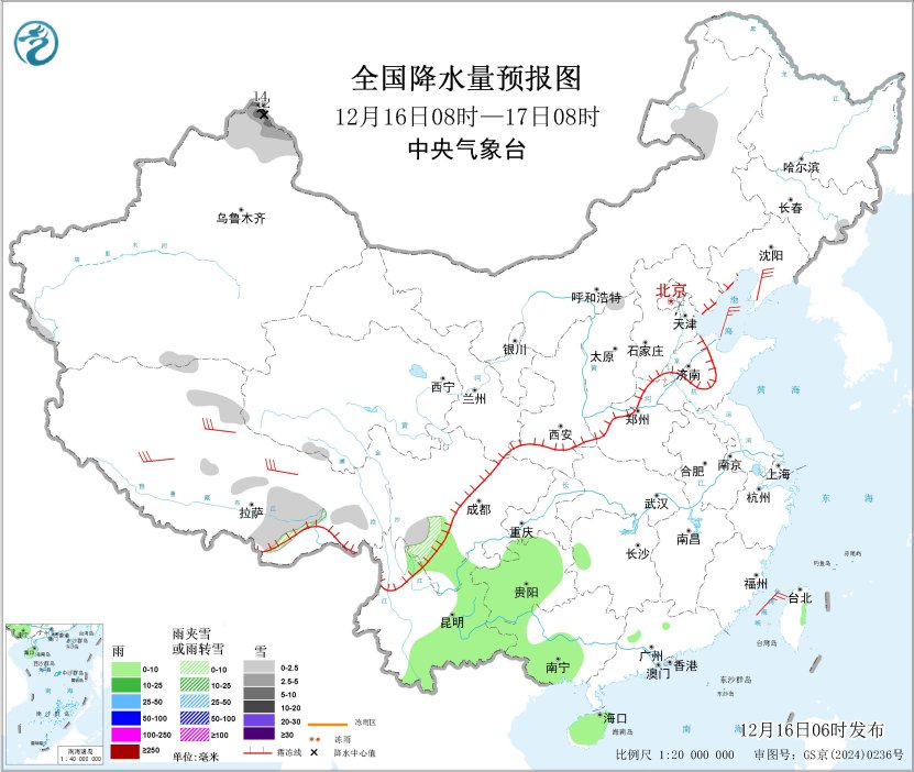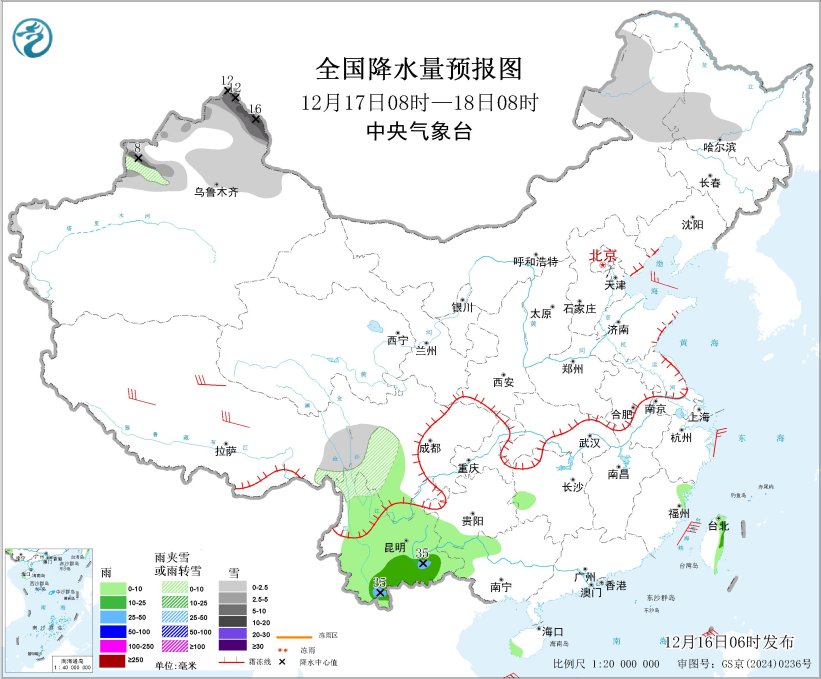 12月16日08时至17日08时,内蒙古东北部、新疆北疆北部、西藏东部和北部、川西高原南部等地部分地区有小到中雪或雨夹雪,其中,新疆北疆北部局地有大到暴雪(10~14毫米)。西南地区东南部、广西西部和南部、海南岛、台湾岛东部等地部分地区有小雨。辽东半岛、西藏中北部等地部分地区有5~6级风;巴士海峡、南海东北部和中东部海域将有6~7级大风、阵风8级。