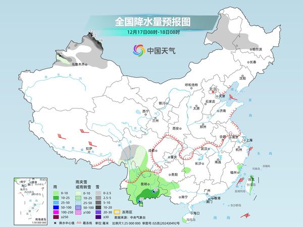 后天,内蒙古东北部、黑龙江中北部、新疆北部和南疆西部山区、甘肃河西等地部分地区有小到中雪或雨夹雪,其中,新疆沿天山地区和伊犁河谷局地有大到暴雪。湖南南部、福建东部和南部、西南地区南部、广西西南部、广东东部和南部、海南岛东部、台湾岛东部等地部分地区有小到中雨,其中,广东东部局地有大雨。