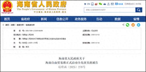 海南省人民政府网站12月16日消息,海南省人民政府发布关于海南自由贸易港正式启动全岛封关的通告。全文如下: