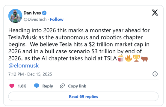 美国知名投行韦德布什(Wedbush Securities)的董事总经理、知名科技分析师丹·艾夫斯(Dan Ives)坚定看好特斯拉的长期上涨前景。该分析师周一在X上发文称,由于特斯拉努力开发和推动其人工智能(AI)项目,在乐观情境下,市值有望在2026年底冲上3万亿美元。