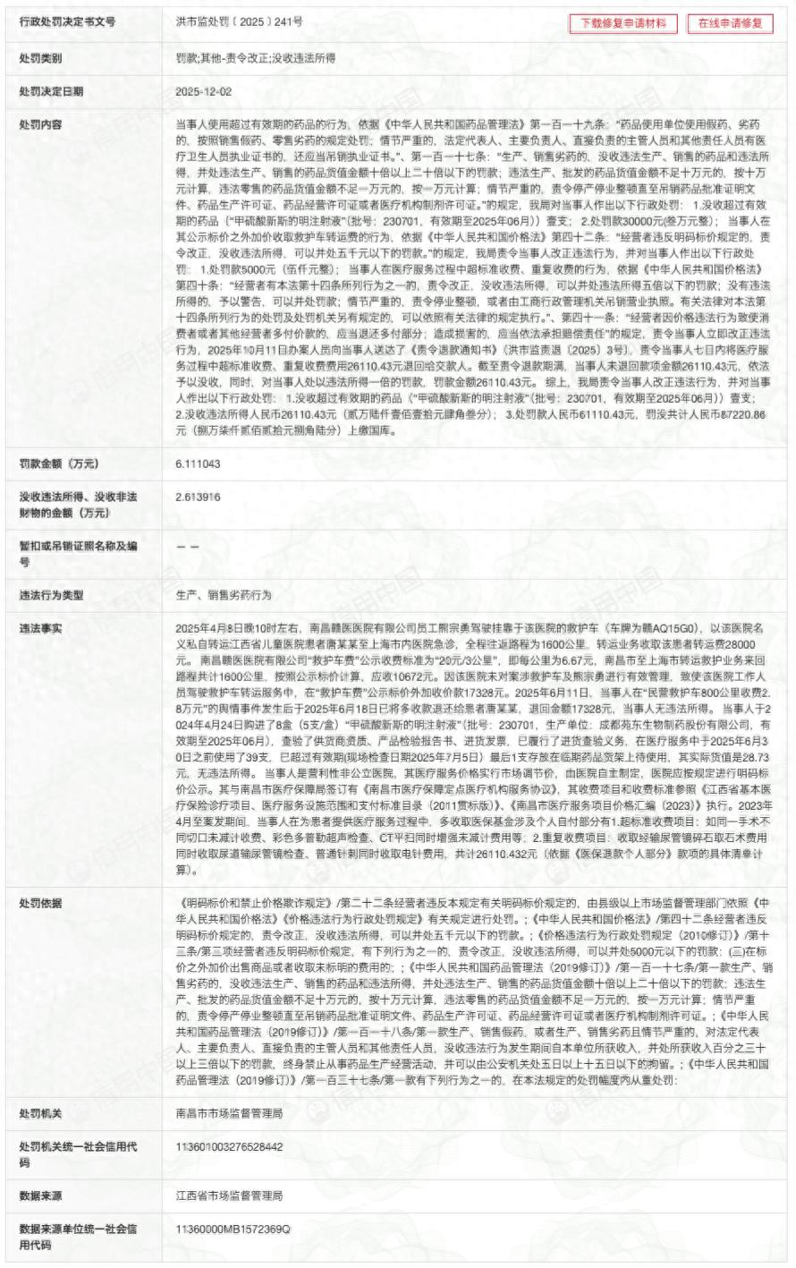 处罚事由显示,该医院员工以该医院名义私自转运江西省儿童医院患者唐某某至上海市内医院急诊,全程往返路程为1600公里,转运业务收取该患者转运费2.8万元,因该医院未对案涉救护车及员工进行有效管理,致使该医院工作人员驾驶救护车转运服务中,在“救护车费”公示标价外加收价款1.7万余元。此外,该医院存在使用超过有效期的药物、在医疗服务过程中有超标准收费、重复收费的行为。