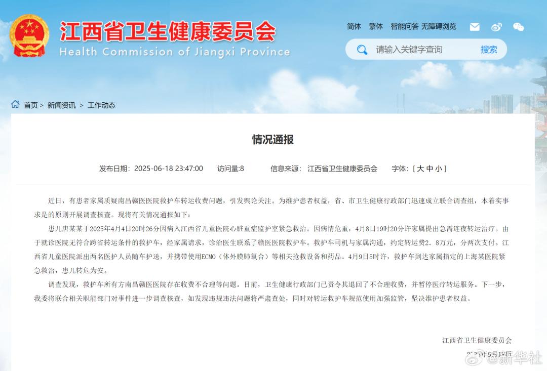 近日,有患者家属质疑南昌赣医医院救护车转运收费问题,引发舆论关注。为维护患者权益,省、市卫生健康行政部门迅速成立联合调查组,本着实事求是的原则开展调查核查。现将有关情况通报如下: