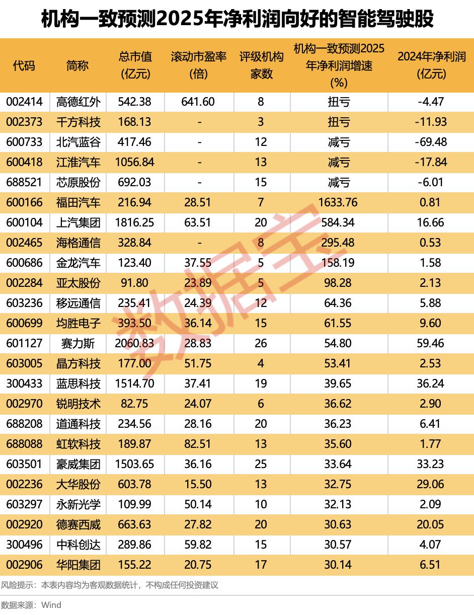 根据3家及以上机构一致预测,在2024年同期盈利的基础上,2025全年净利润增速有望超过30%的智能驾驶股共计19只。福田汽车、上汽集团、海格通信、金龙汽车净利润增长翻倍,同比增速依次为1633.76%、584.34%、295.48%、158.19%。此外,高德红外、千方科技等则有望扭亏为盈。