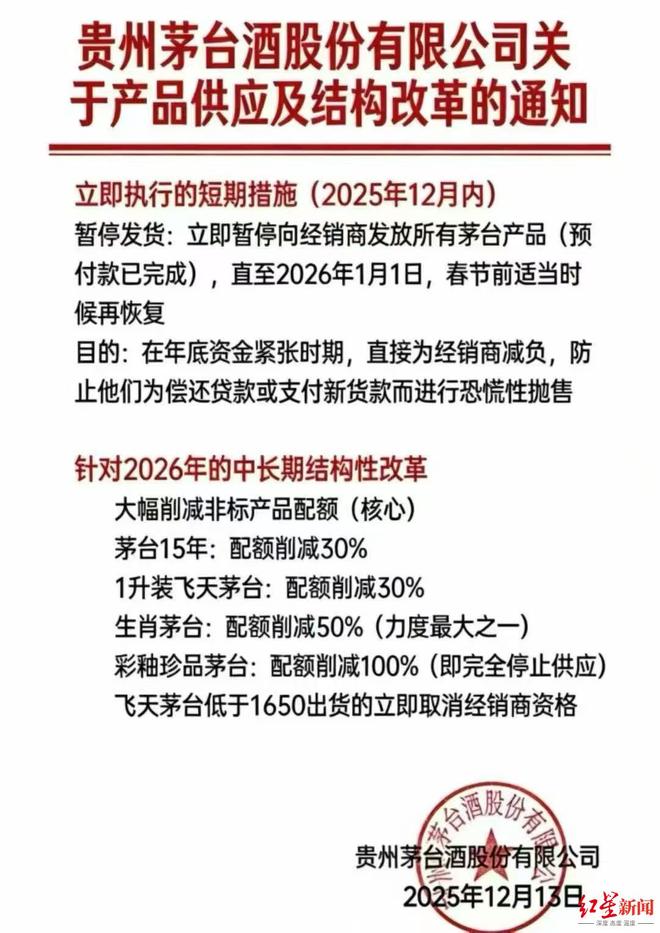 此前,市场流传一张标题为《贵州茅台酒股份有限公司关于产品供应及结构改革的通知》的文件。有茅台经销商告诉红星资本局,这份文件在他所在的很多经销商群里转发。但红星资本局注意到,该文件落款印章为“贵州茅台酒股份有限公”,少了“司”字。