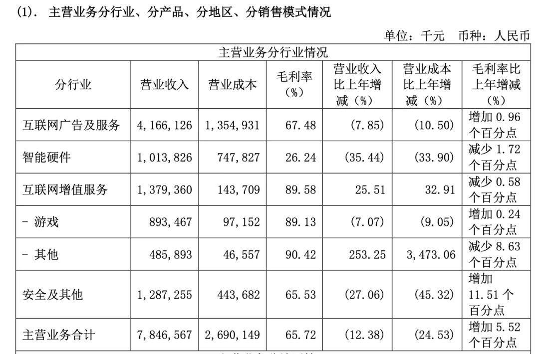 根据2024年年报披露的业务分类,360集团主营业务涵盖互联网广告及服务、智能硬件、包含游戏板块的互联网增值服务,以及安全及其他业务。分业务营收数据显示,互联网广告及服务仍是核心营收支柱,2024年收入为41.66亿元,同比下降7.85%,营收占比超五成;智能硬件业务(涵盖智能摄像机、可视门铃、行车记录仪等产品)收入10.14亿元,同比大幅下滑35.44%;安全及其他业务收入12.87亿元,同比下降27.06%。