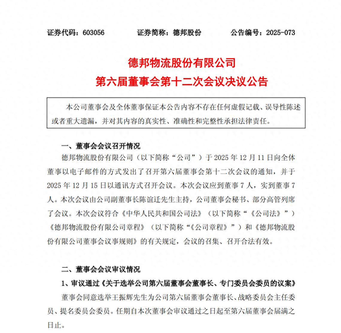 12月16日,德邦物流(603056.SH)发布第六届董事会第十二次会议决议公告称,同意选举王振辉为公司第六届董事会董事长、战略委员会主任委员、提名委员会委员。任期自本次董事会审议通过之日起至第六届董事会届满之日止。