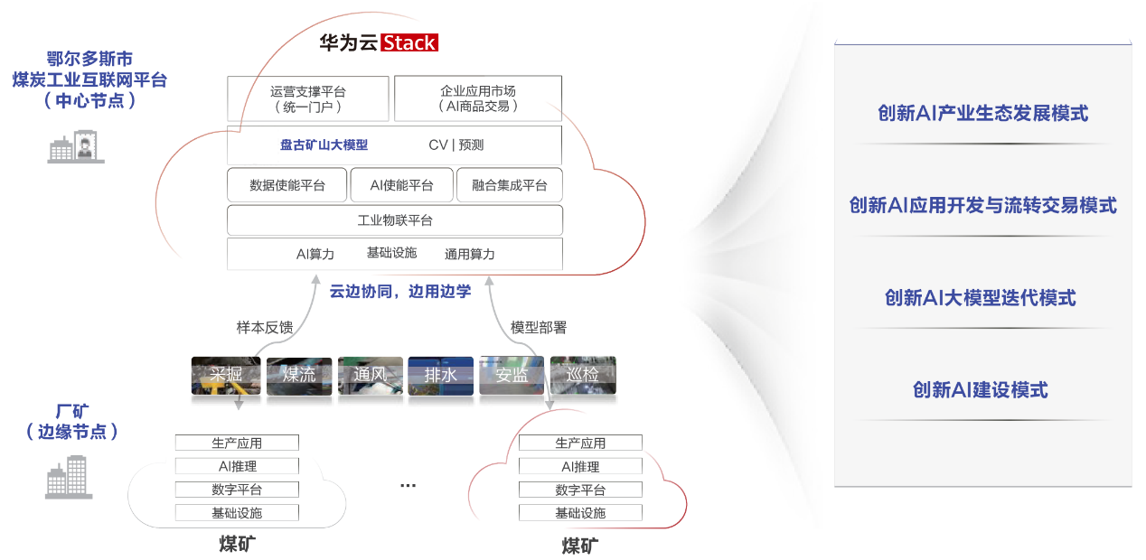 具体来说,鄂尔多斯工业互联网平台依托华为云盘古矿山大模型构建“中心训练、边缘推理、云边协同、边用边学、持续优化”训练机制,平均识别精度提升15%以上,达到可视、可管、可溯规范化作业,有效提高了生产效率和效益;同时,基于华为云Stack开展统一标准、统一架构、统一数据规范的集约化建设,构建了一站式AI模型服务的企业应用市场,打通本地应用市场与华为云商城的互联互通,共享生态,简化AI产品与解决方案的交易成本。