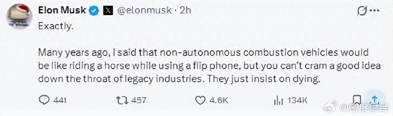 马斯克回应称:“完全正确。多年前,我就说过,非自主内燃机汽车就像一边骑马一边使用翻盖手机,但你不可能把一个好主意硬塞给传统行业。他们只是坚持去死。”