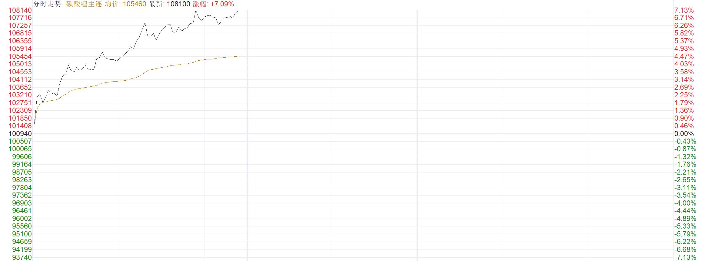 同期,碳酸锂期货早盘大幅拉升,涨幅超7%,报108100元/吨,市场情绪显著升温。