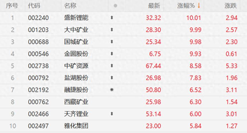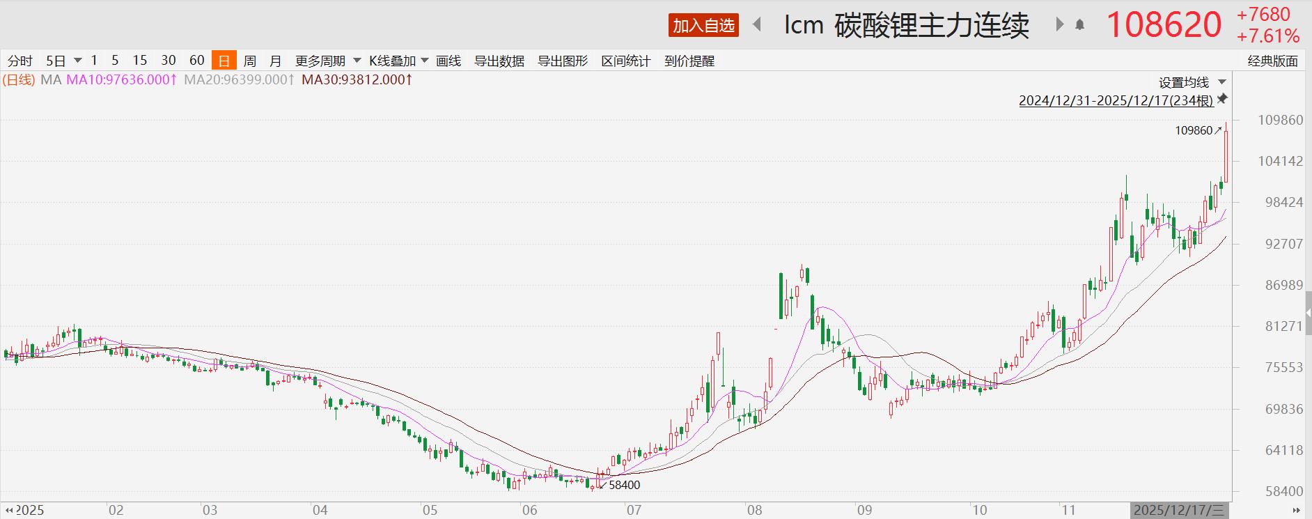 今早,碳酸锂期货主力合约大幅上涨,盘中涨幅一度超过8%,报108600元/吨上方,创2024年5月以来新高,今年累计涨幅约40%。锂矿概念股盛新锂能、中矿资源、天华新能、金圆股份、盛新锂能、盐湖股份、国城矿业等表现强劲。
