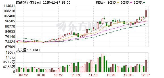 与此同时,碳酸锂期货市场大涨。12月17日,碳酸锂主力合约2605价格上涨7680元/吨,收报10.86万元/吨,该合约收盘价格已经连续3个交易日超过10万元/吨。过去一个月,碳酸锂2605的价格维持在9.2万元/吨以上,但低于10万元/吨。