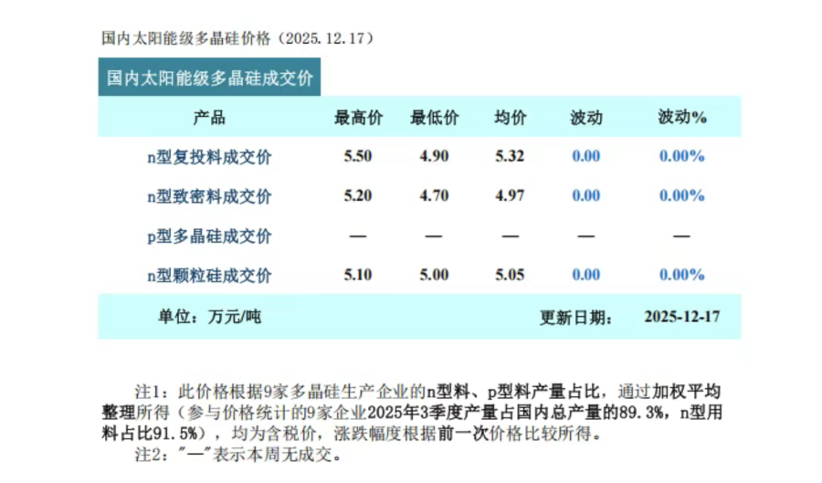 12月17日,中国有色金属工业协会硅业分会(下称硅业分会)发布的数据显示,据安泰科统计,本周多晶硅N型复投料成交价格区间为4.9万-5.5万元/吨,成交均价为5.32万元/吨;N型颗粒硅成交价格区间为5.0万-5.1万元/吨,成交均价为5.05万元/吨。
