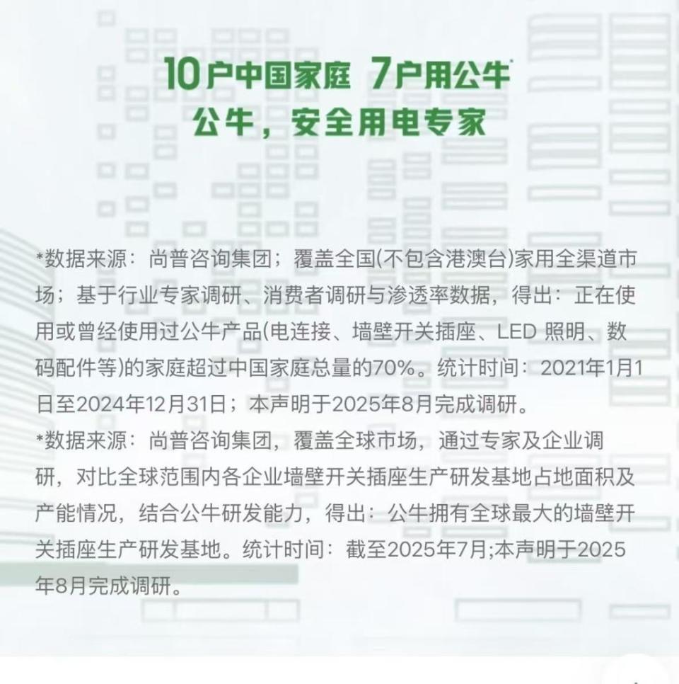 对于这句宣传语,公牛集团在官网上对此也有说明,“数据来源:尚普咨询集团;覆盖全国(不包含港澳台)家用全渠道市场;基于行业专家调研、消费者调研与渗透率数据,得出:正在使用或曾经使用过公牛产品(电连接、墙壁开关插座、LED 照明、数码配件等)的家庭超过中国家庭总量的70%。统计时间:2021年1月1日至2024年12月31日;本声明于2025年8月完成调研。”