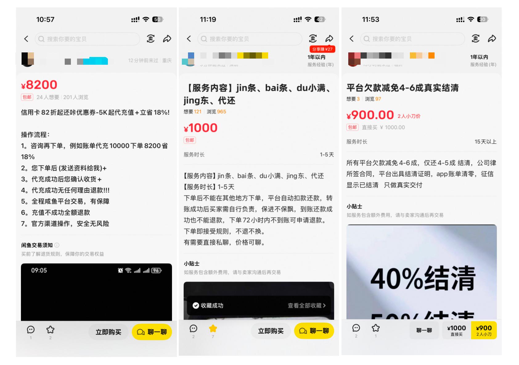 近日,时代周报记者注意到,在闲鱼等二手交易平台,一种以“高折扣还款”为诱饵的灰色服务悄然蔓延。“还款优惠券”“信用卡82折起还卡优惠券”“平台欠款减免4-6成真实结清”等极具诱惑力的广告,吸引着大量深陷债务泥潭的借款人。