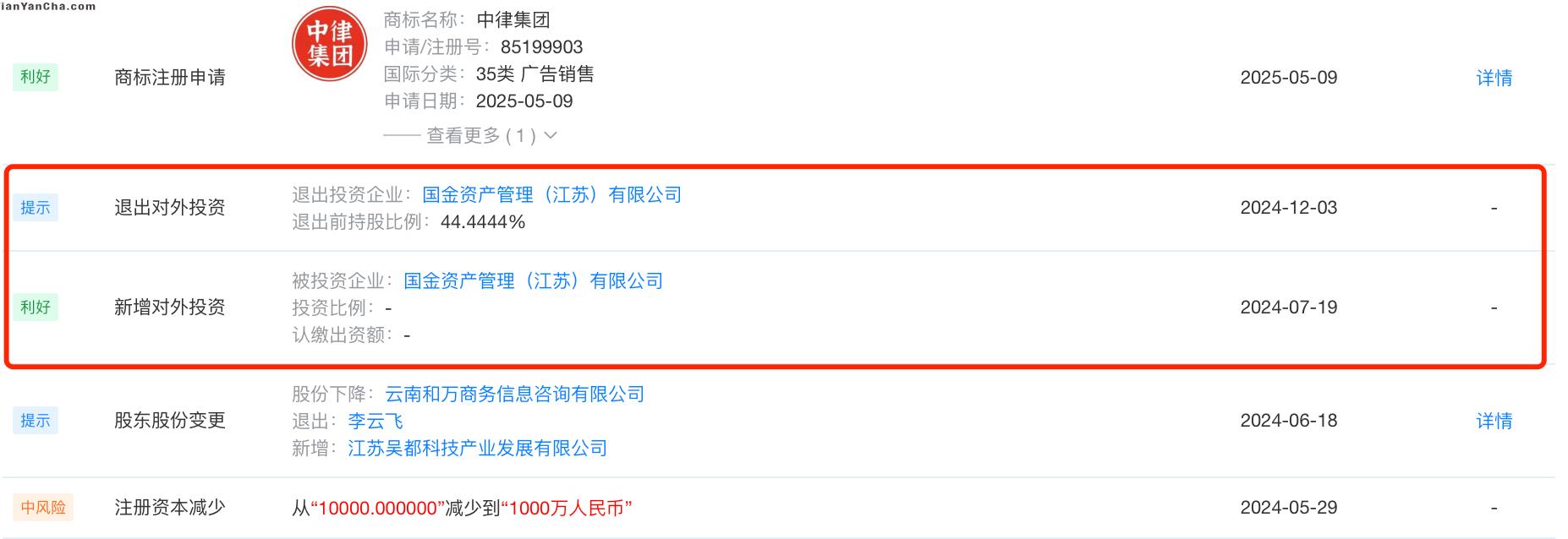 天眼查显示,中律集团曾于2024年7月19日新增对外投资,投资标的为国金资产;2024年12月3日,退出投资,退出前持股比例44.44%。