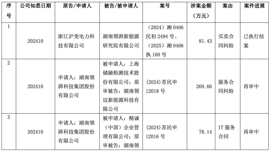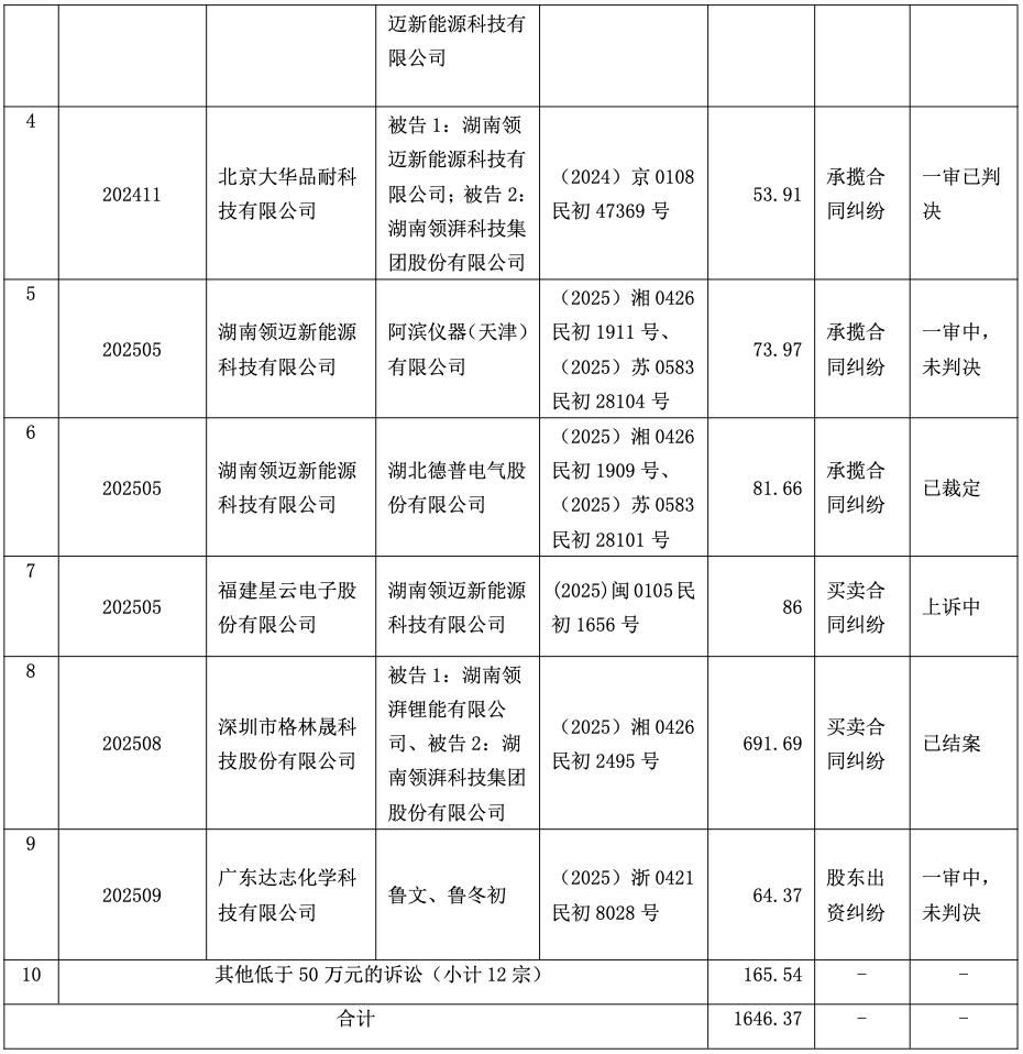 此外,领湃科技还诉讼缠身。10月9日,公司发布关于累计诉讼、仲裁案件情况的公告,截至公告披露之日,公司及子公司连续十二个月内累计未披露的诉讼21宗,涉案金额合计为1,646.37万元,占公司最近一期经审计净资产绝对值(16,281.07万元)的10.11%。