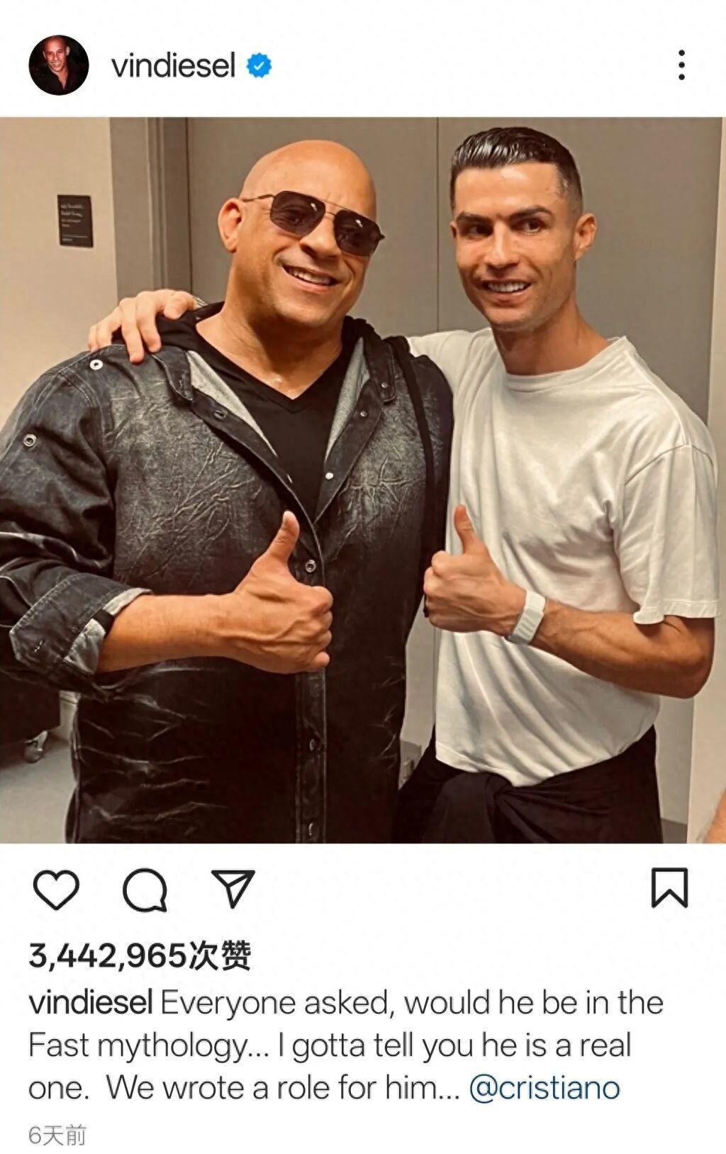 上周,“速激”系列电影主角范·迪塞尔在其社交网站上晒出他与C罗的合照,并配文——“很多人都来问,他是否会加入“速激”大家庭……我想说,这是真的,我们专门为他安排了一个角色”。范·迪塞尔还在文末艾特了C罗。