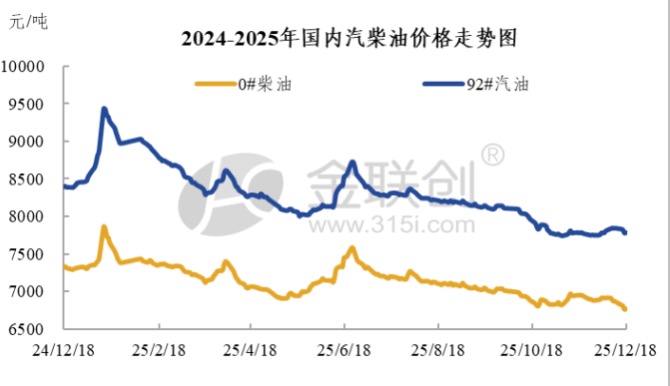 本国国内汽柴油价格整体呈现震荡下滑走势,市场成交气氛表现清淡。具体来看,周内国际原油价格震荡走跌,使得零售价下调预期不断拉宽,消息面对国内油市形成一定的抑制作用,业者操作心态仍显谨慎,汽柴油价格承压回落。需求方面,汽油市场缺乏利好支撑,虽元旦假期临近,但从终端企业的补仓需求来看,业者并不急于采购,成交并无明显增量;柴油方面,由于目前需求面表现疲软,价格承压,随着价格不断下跌,低库存业者择低有谨慎补库,但持续性不足。
