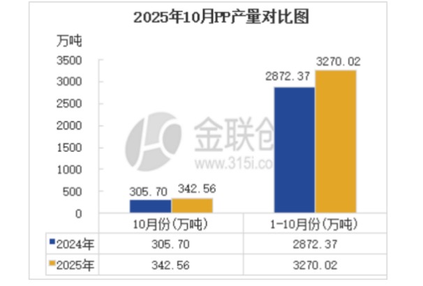 国内产能爆发:近年来,中国聚丙烯行业处于新一轮扩能周期。2025年10月份国内PP粒总产量342.56万吨,同比去年(305.70吨)上涨36.86万吨,涨幅12.06%。1-10月份国内PP粒总产量3270.02万吨,较去年同期(2872.37万吨)涨13.84%。国内供应极为宽松,价格长期处于全球洼地,直接削弱了进口料的竞争力。