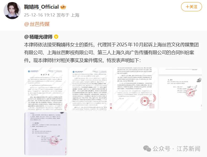 近日,知名演员、歌手鞠婧祎与经纪公司丝芭传媒的合约纠纷愈演愈烈,引发关注。双方你来我往,各执一词。