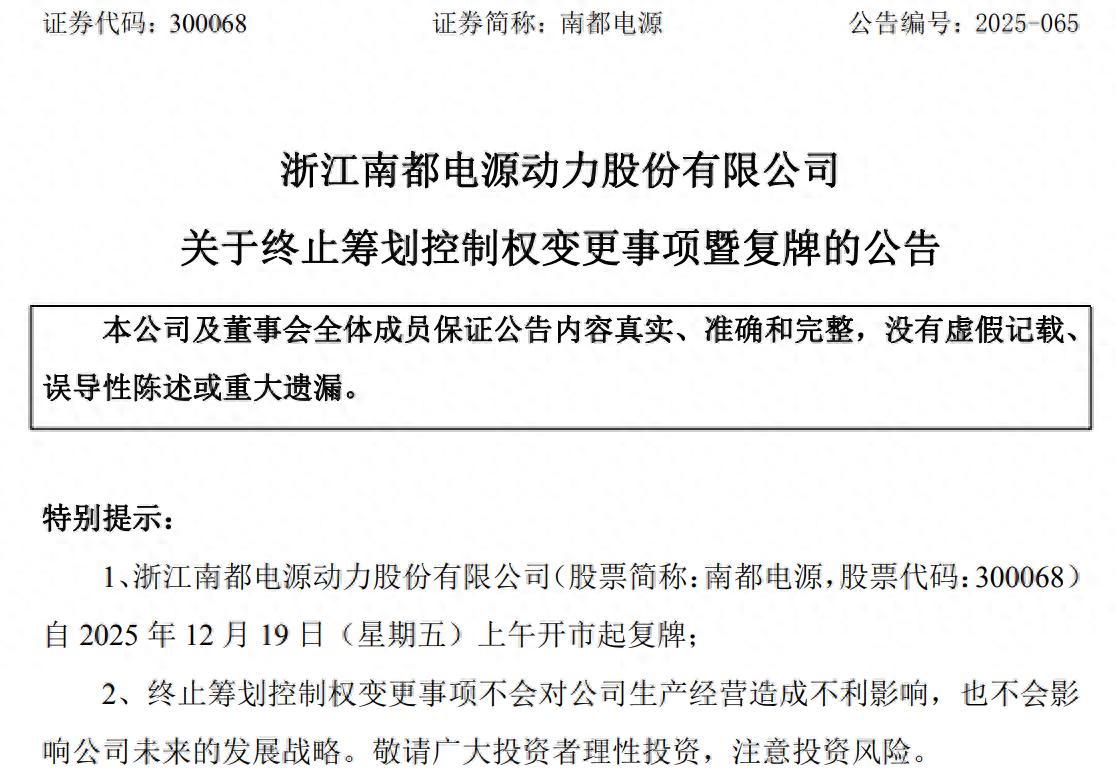 筹划控制权变更事项仅一周时间,南都电源(300068)12月18日晚间披露公告称,终止筹划控制权变更事项,公司股票自12月19日起复牌。