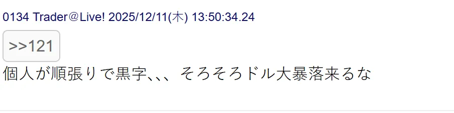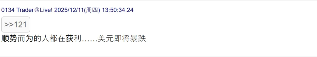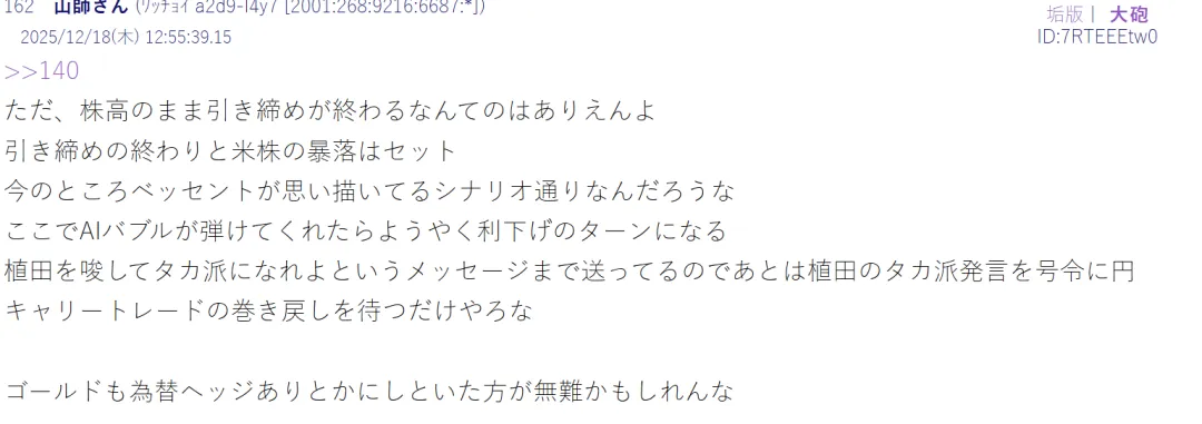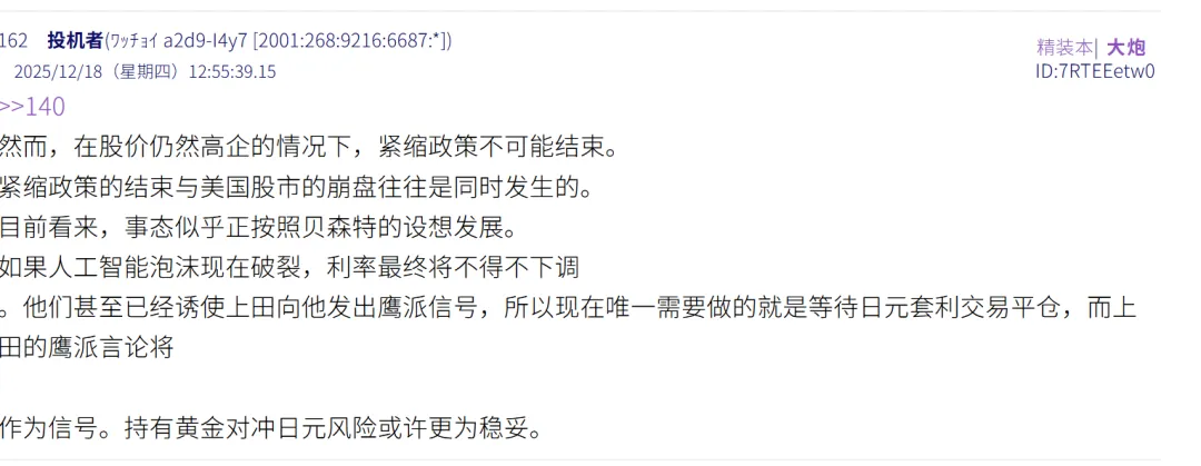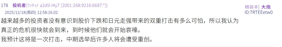 事实上,“渡边太太”们早已嗅到了风向的转变。在12月初日本央行行长释放加息信号后,日本热门网络论坛中就出现了“美元即将大跌”“真正的危机很快就要到来”等言论。
