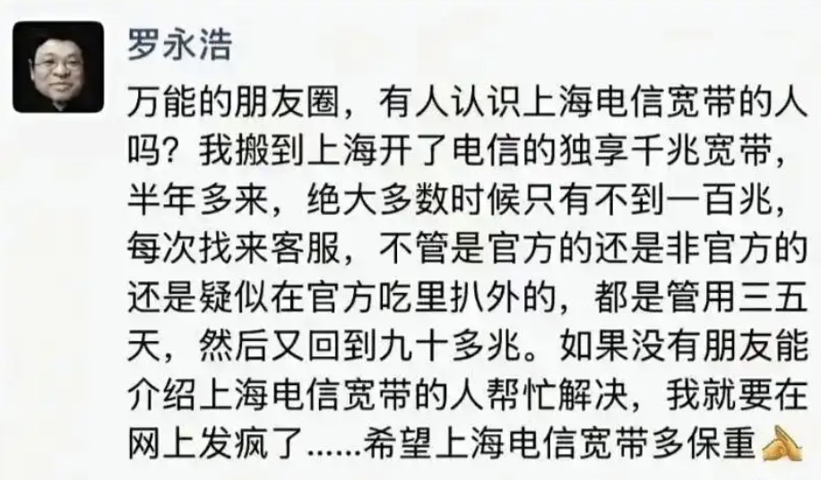 无可奈何之下,罗永浩通过朋友圈表示希望能有朋友介绍上海电信宽带的人帮忙解决:“我就要在网上发疯了……希望上海电信宽带多保重。”
