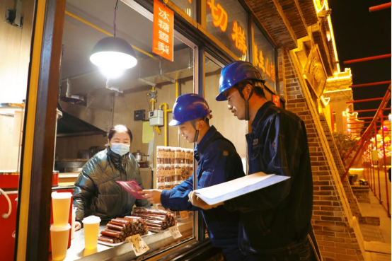 环州故城是国家4A级旅游景区,与夜市形成深度文旅联动模式,日均客流量超万人次,已成功入选“甘肃省十大夜间经济示范区”。为保障夜市安全稳定供电,国网庆阳供电公司提前谋划部署,针对夜市用电“小、散、乱”的痛点,健全完善供电保障机制,一方面主动对接200余家商户,建立“一户一档”用电信息台账,精准掌握商户用电需求;另一方面强化夜间特巡力度,对景区周边供电台区和线路开展高频次测温巡检,建立隐患台账并实行闭环管理。当天,该公司工作人员共排查整改线路老化、插座松动、负荷过载等安全隐患13处,发放宣传资料120余份,现场解决商户各类用电难题17个。