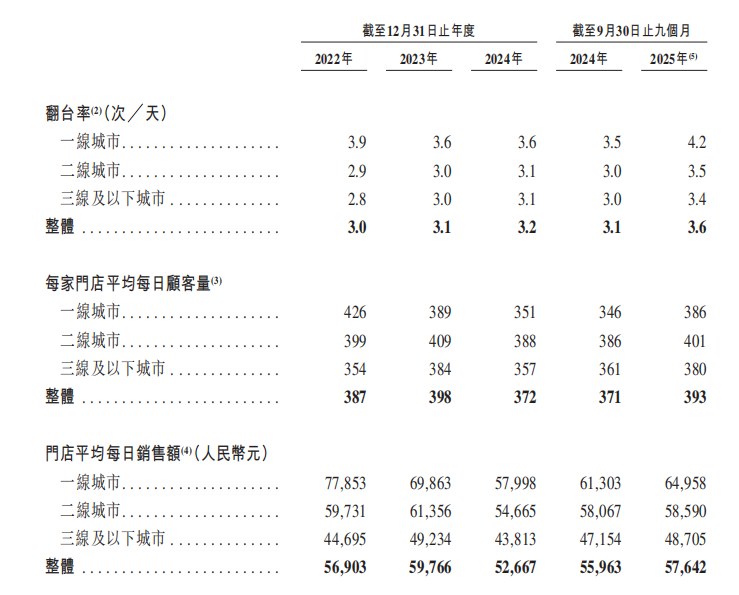 同店销售额主要受翻台率及顾客人均消费影响。巴奴招股书指出,同店销售额于2022年至2023年增长22.6%,主要是由于疫情后运营恢复正常且运营能力增强,进而推动所有主要市场的客流量大幅回升。相比之下,同店销售额于2023年至2024年下降9.9%,由于巴奴主要通过积极调整产品组合扩展客群,并扩大竞争优势以应对市场趋势,致使顾客人均消费从2023年的150元减少至2024年的142元。截至今年9月30日,同店销售额增长4.3%,主要是由于同店翻台率从3.1增至3.5,尽管同期顾客人均消费从148元下降至138元。