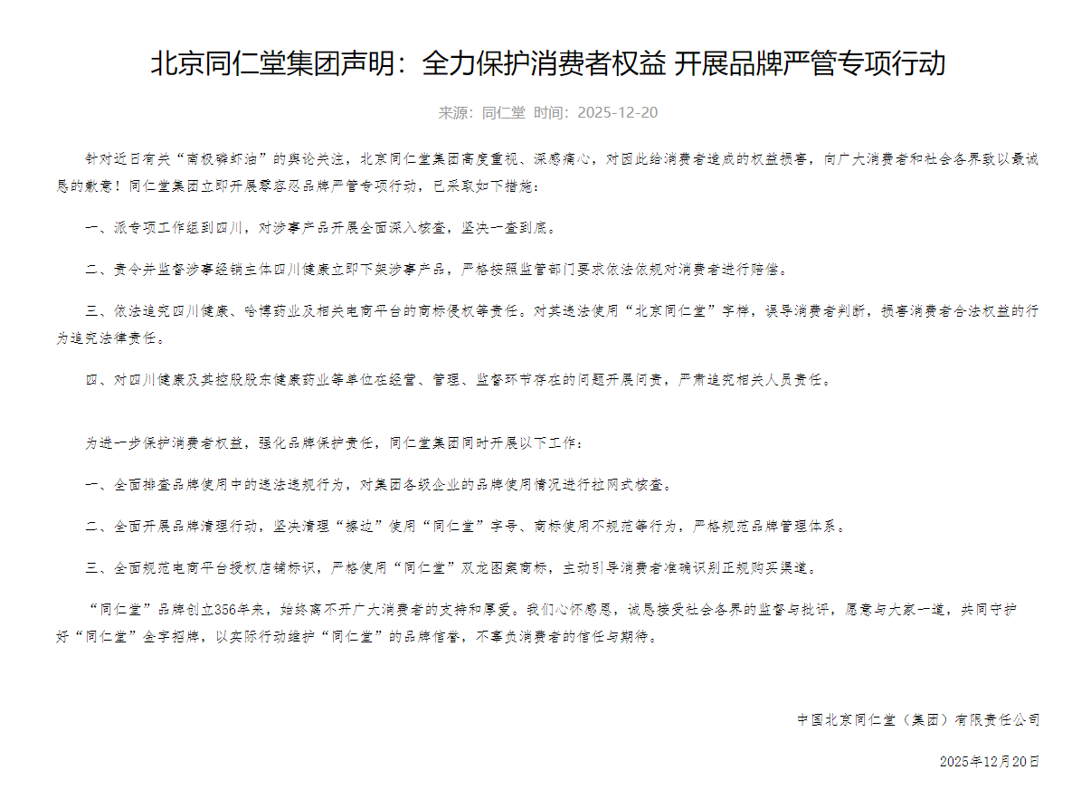 12月20日,中国北京同仁堂(集团)有限责任公司发布声明,针对近日“南极磷虾油”产品造假事件向消费者和社会各界致歉,并宣布启动“零容忍品牌严管专项行动”。