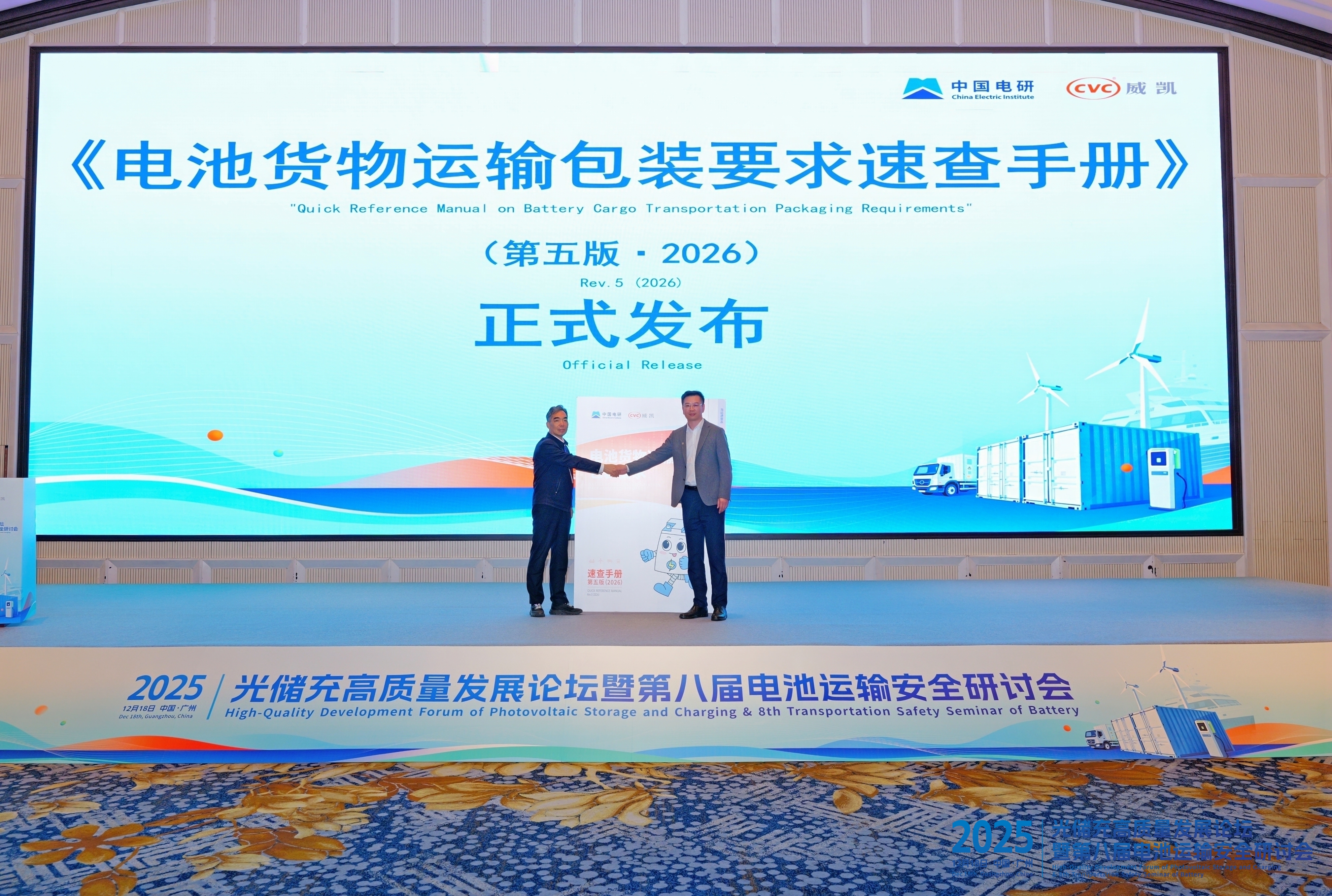 为进一步保障储能产品运输安全,近年来国内外对电池以及运输相关规则更新变得愈发频繁。针对电池运输安全这一行业焦点,中国电研威凯检测在会上正式发布其编写的《电池货物运输包装要求速查手册(第5版·2026)》。该手册实现海、陆、空、铁路运输方式全覆盖,帮助企业推动电池运输安全标准落实,进一步推动技术创新、保障公共安全。