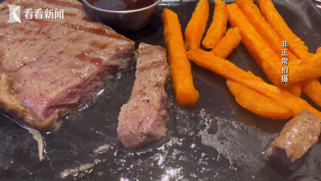 端上来的牛排,看起来与菜单上的确实有差别,口感也不像原切牛肉。
